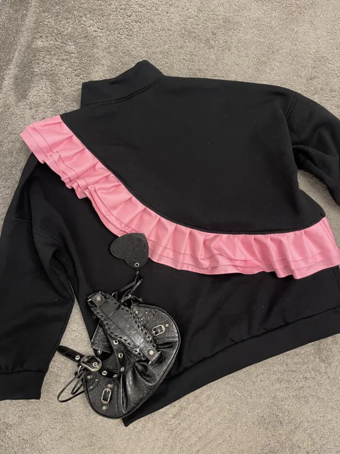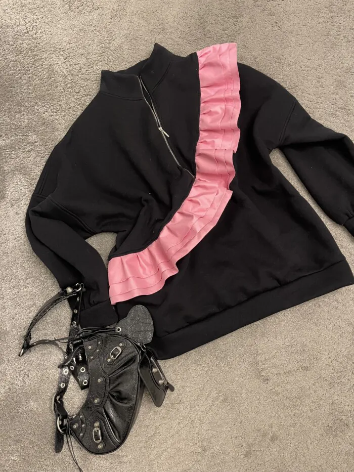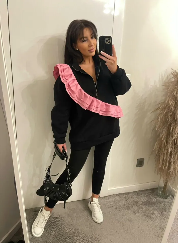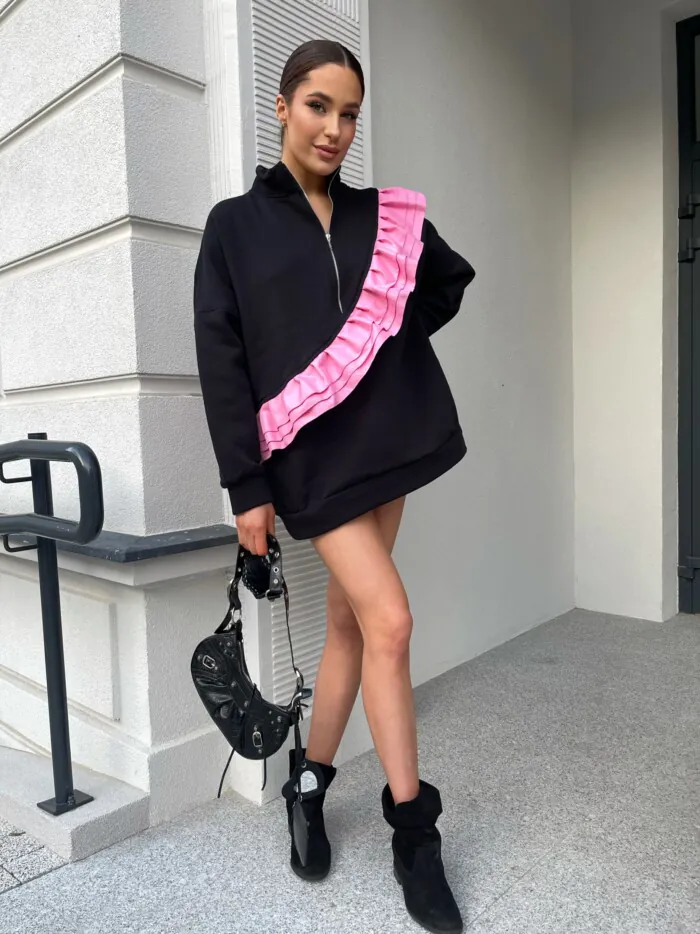 Bluza o kroju OVERSIZE z zamkiem przy biuście oraz ozdobnymi falbanami na przodzie i tyle bluzy.