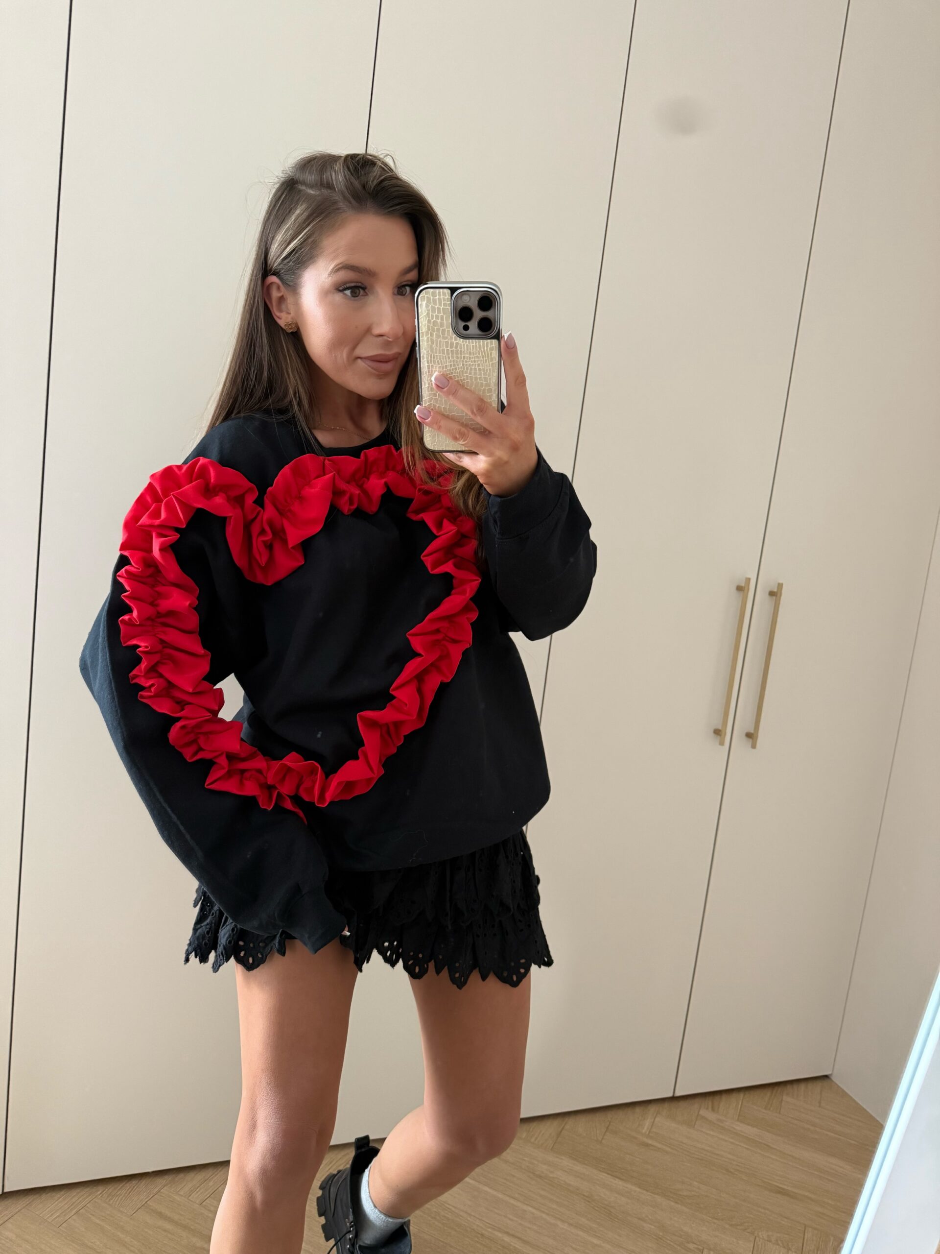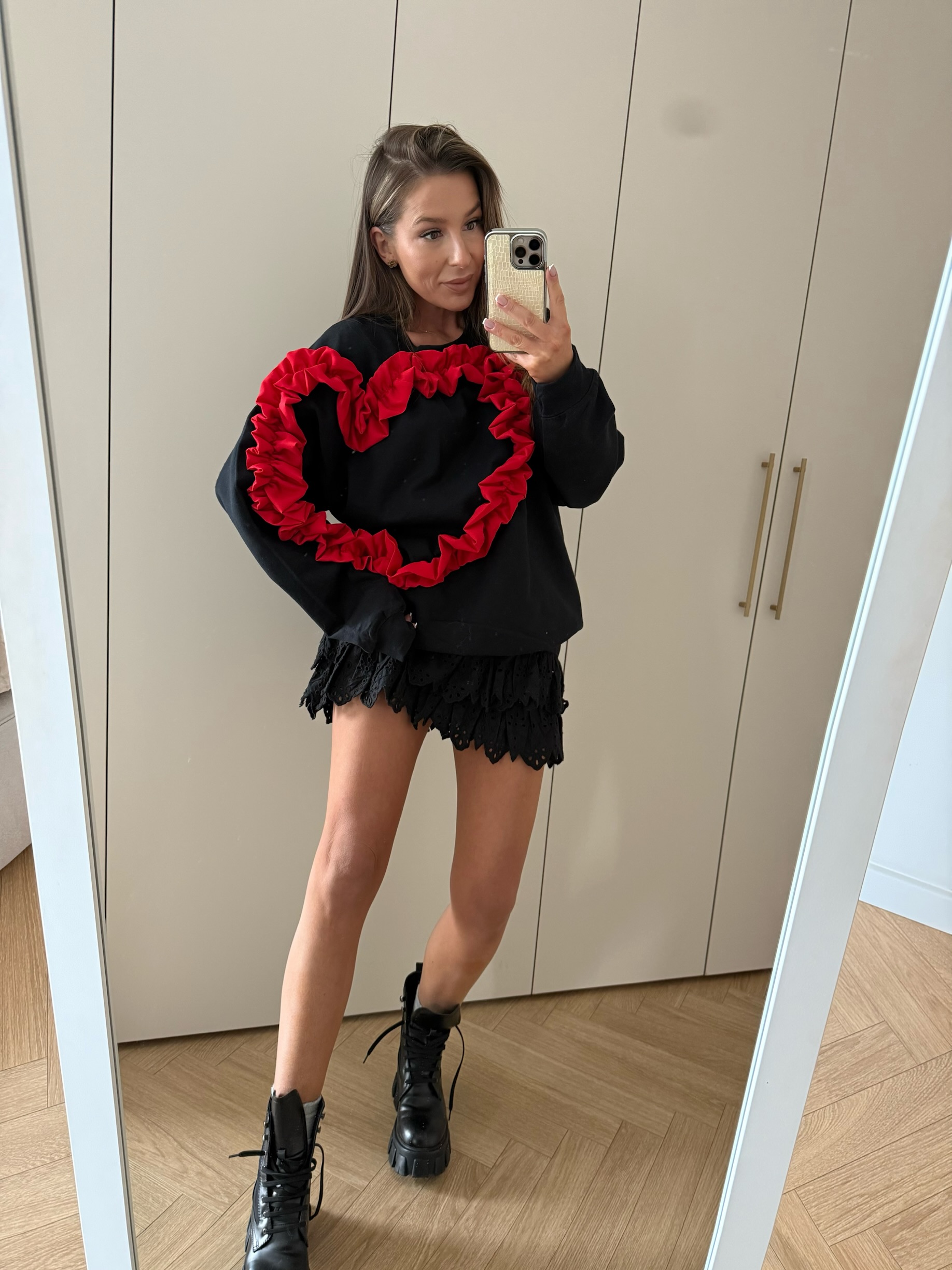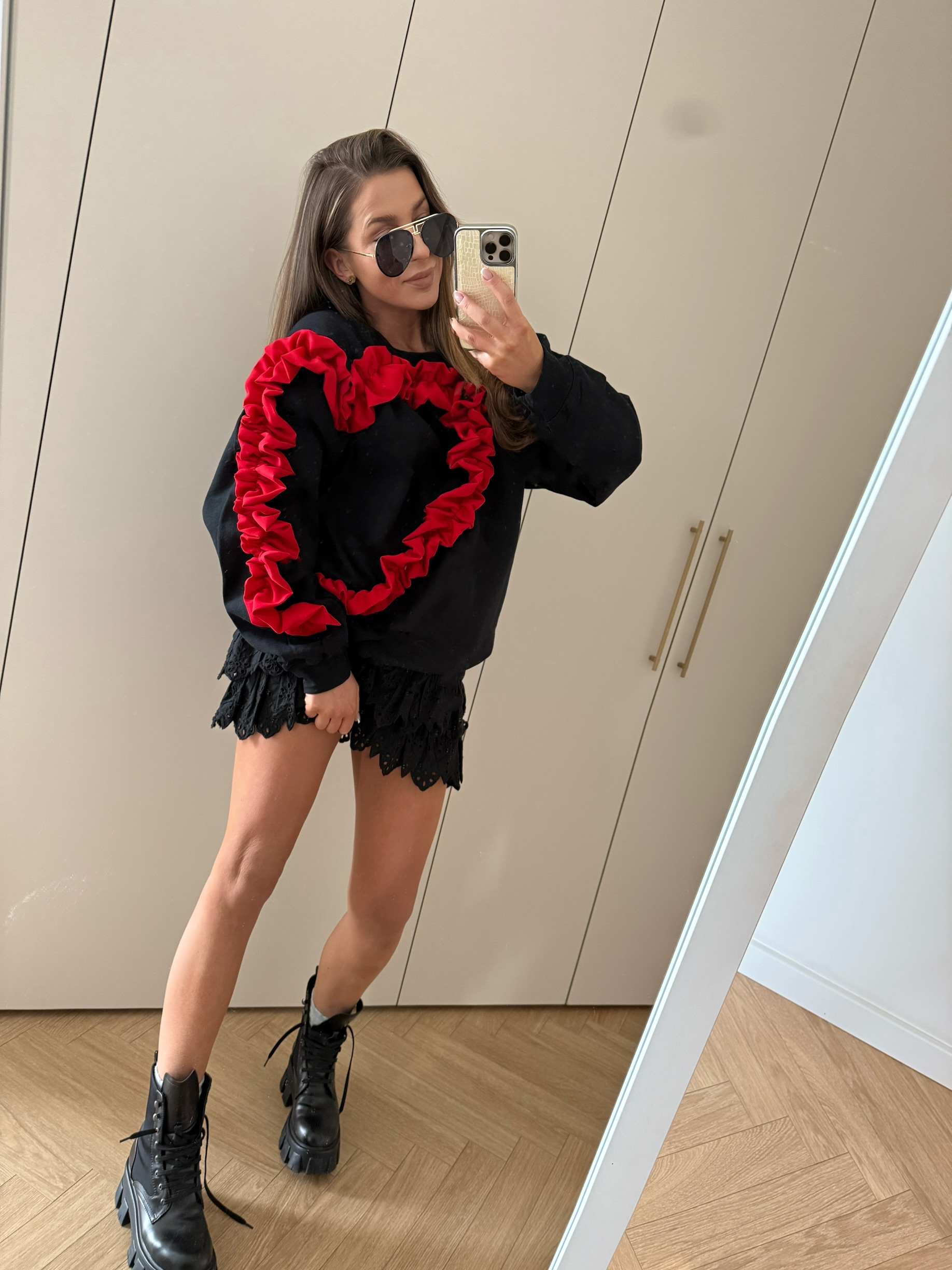 Lekko ocieplana bluza z falbankami które układają się w kształt serca. Czas oczekiwania na wysyłkę : około 3 dni robocze.