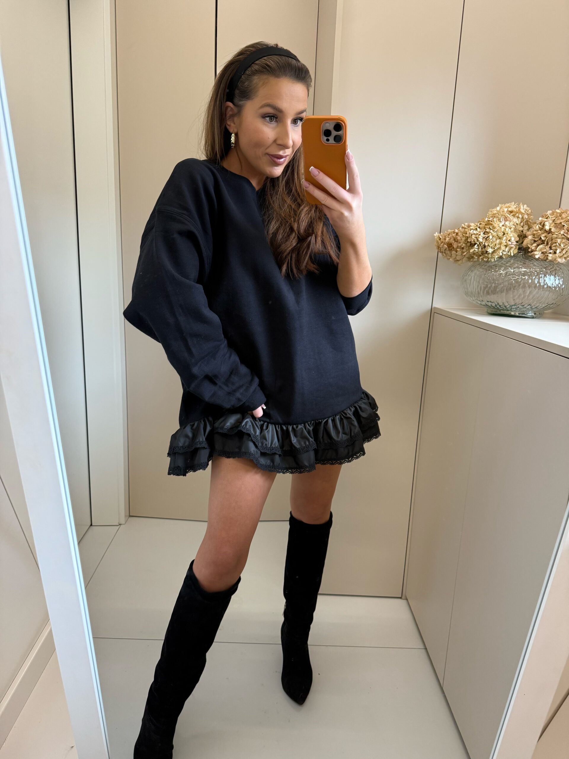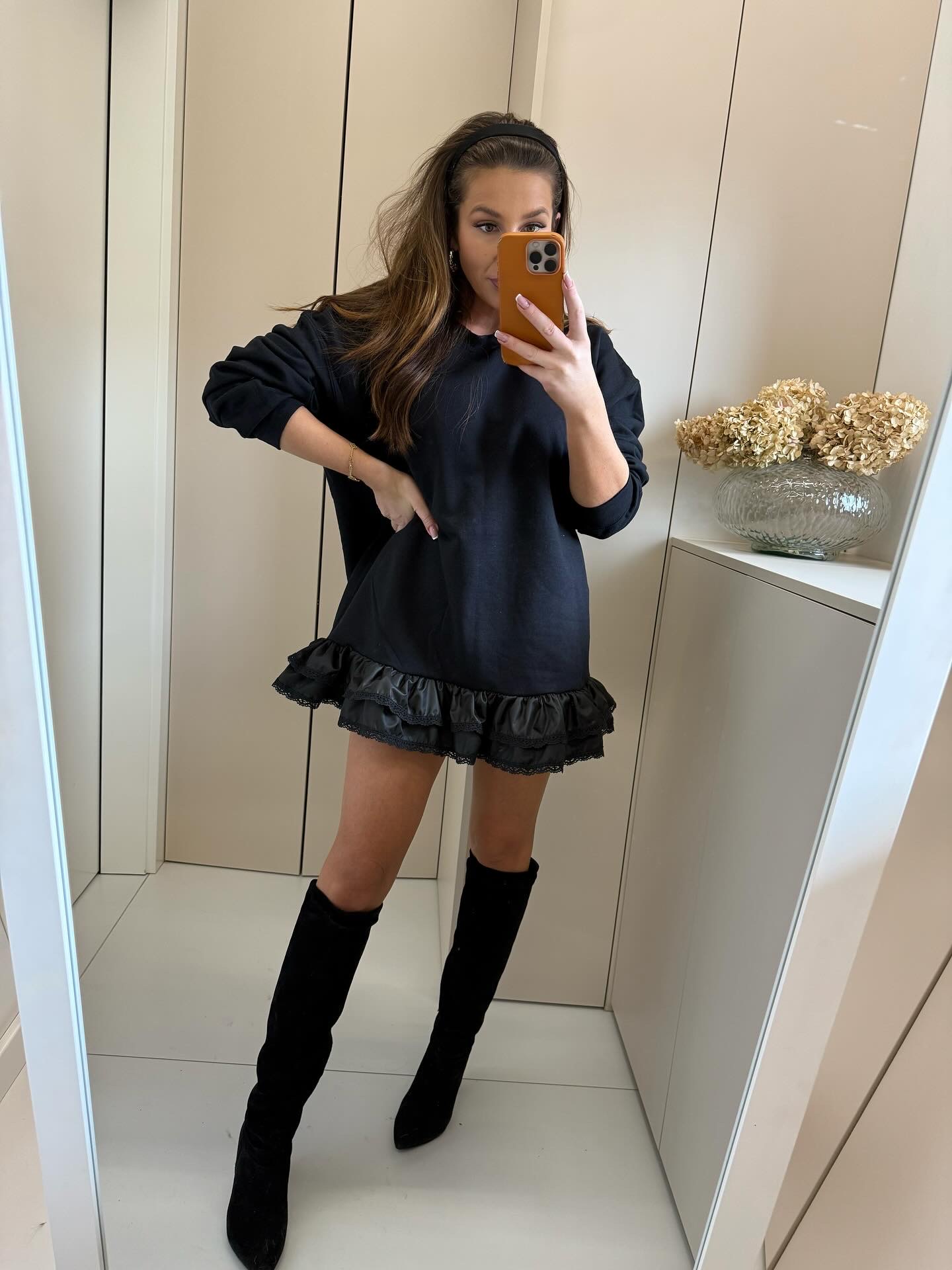 Dresowa sukienka o kroju oversize z falbanką i koronką .