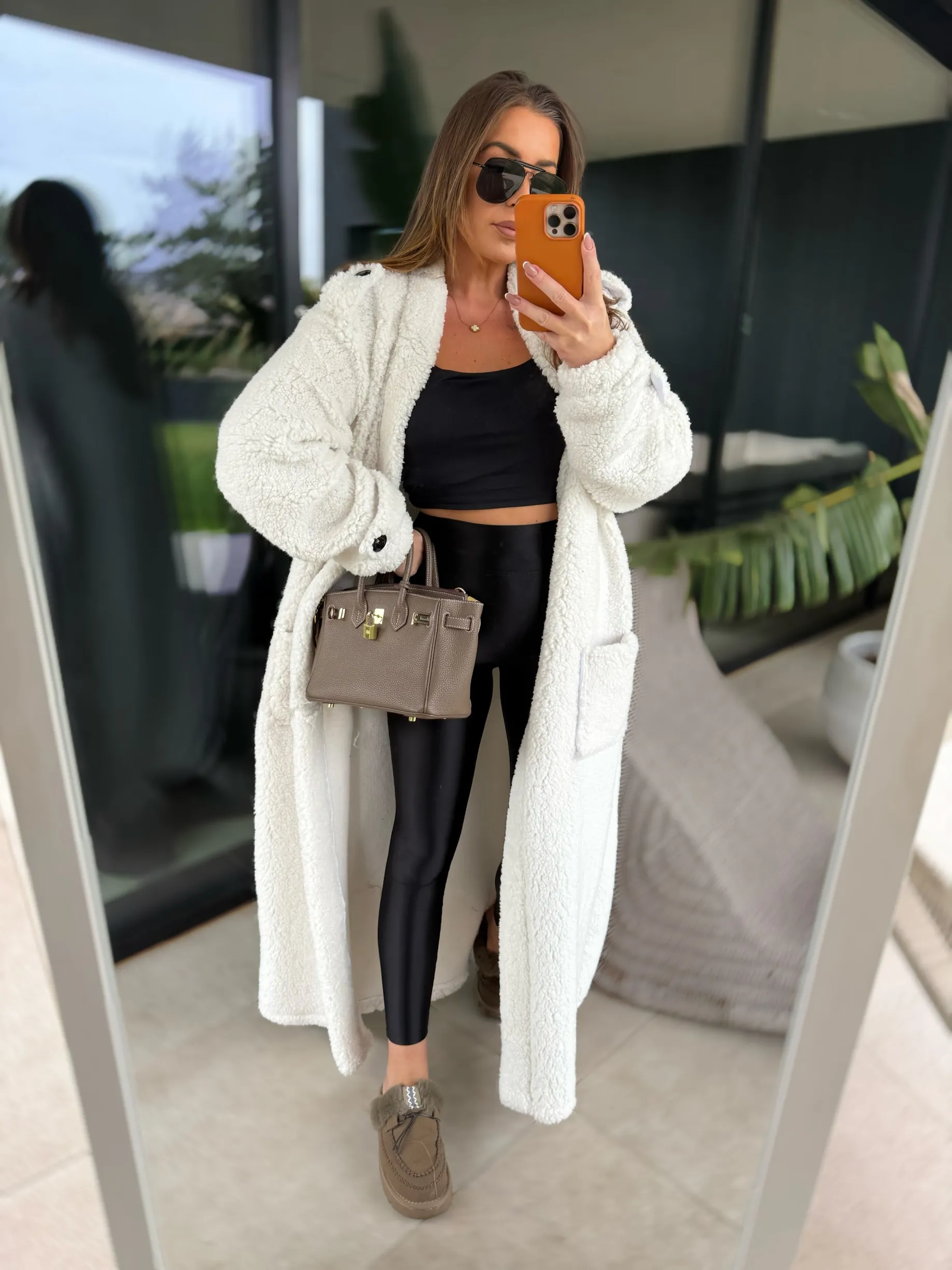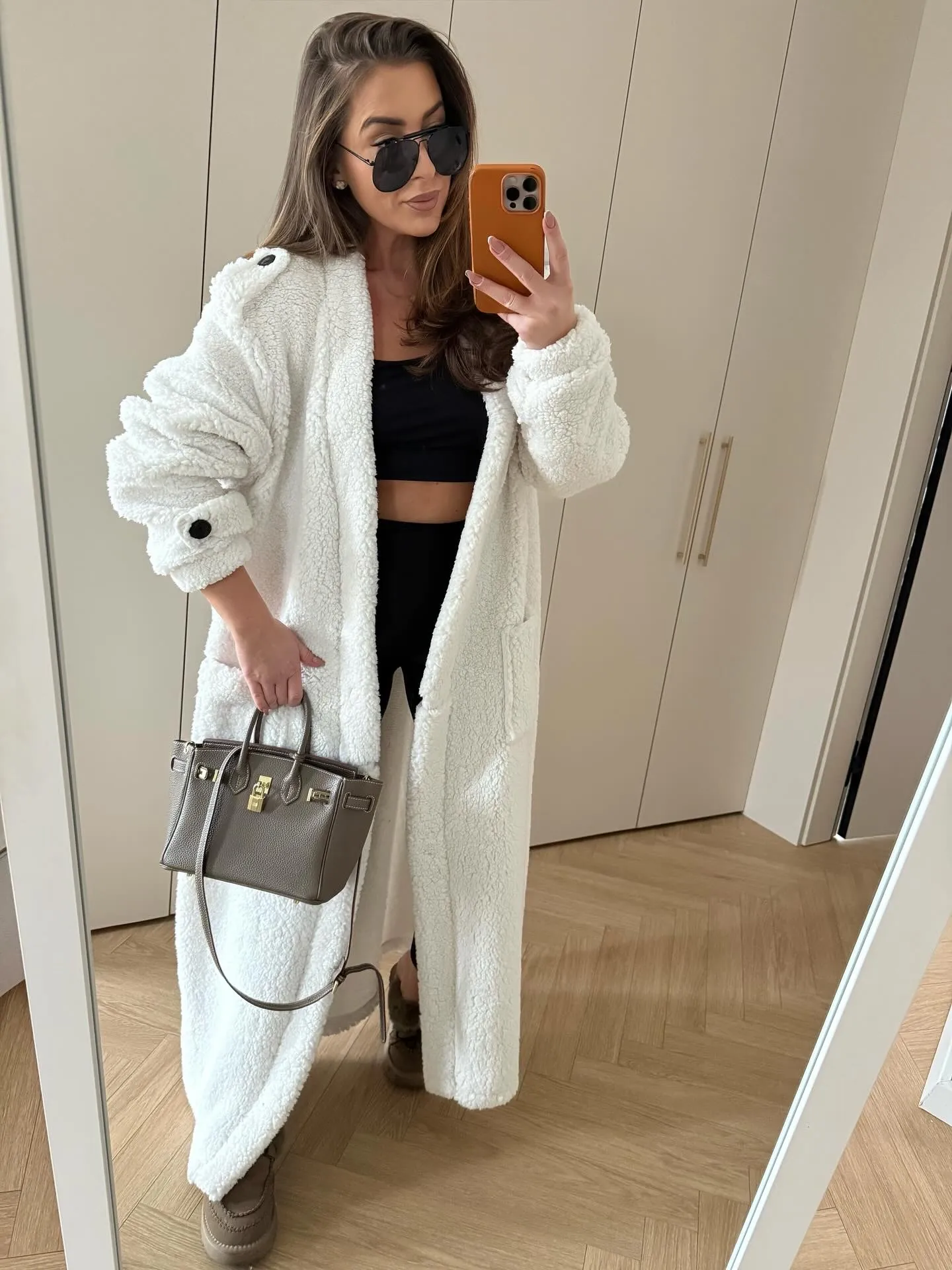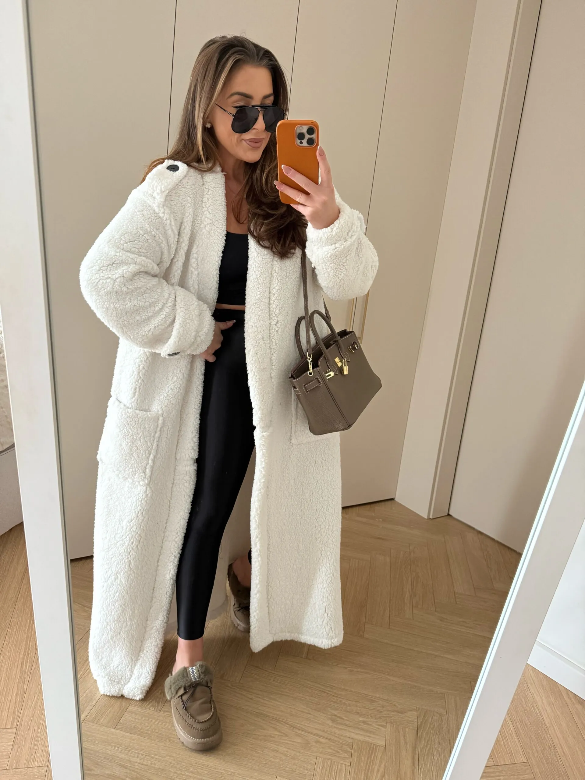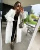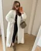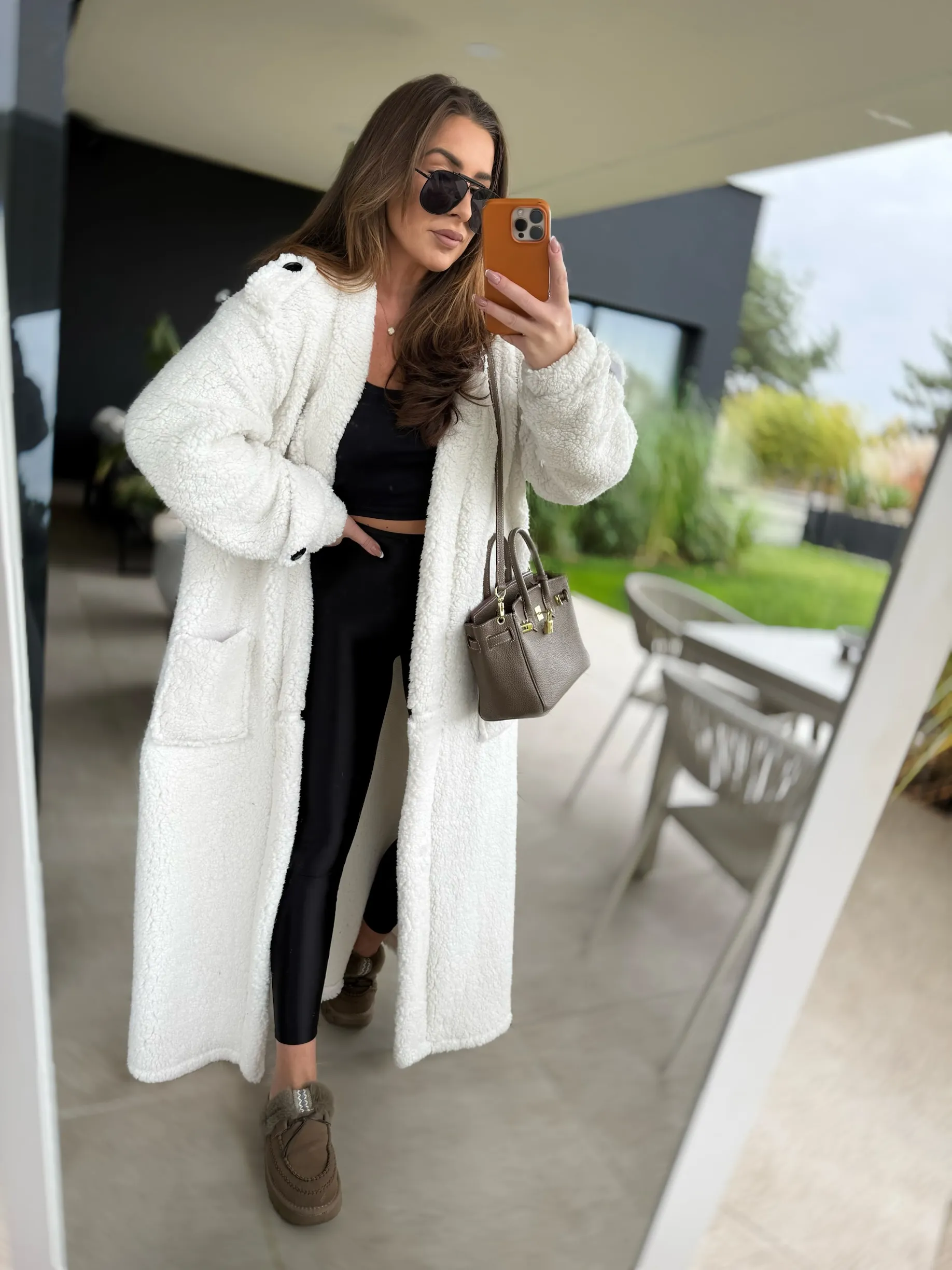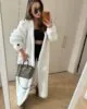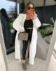 Kardigan maxi uszyty z miękkiej tkaniny Boucle w kolorze śmietankowym. W komplecie pasek .