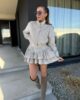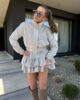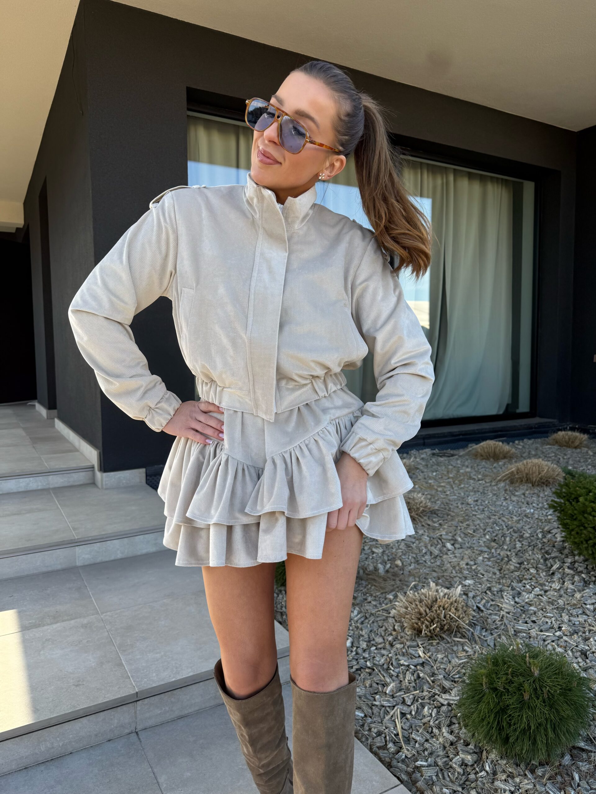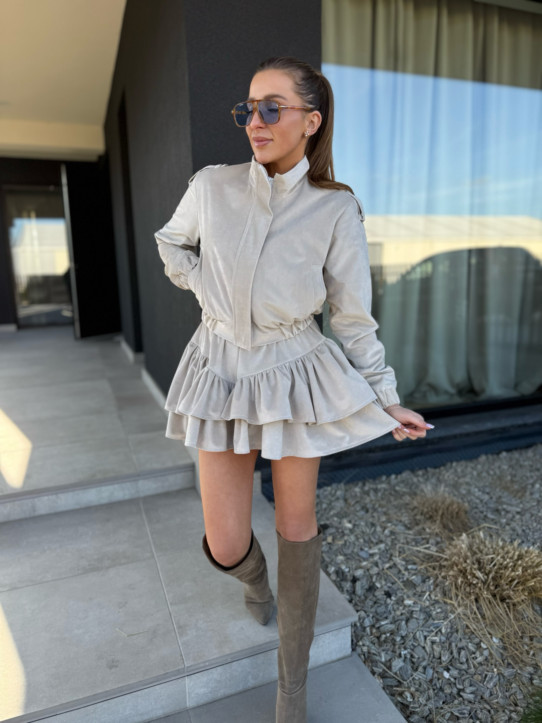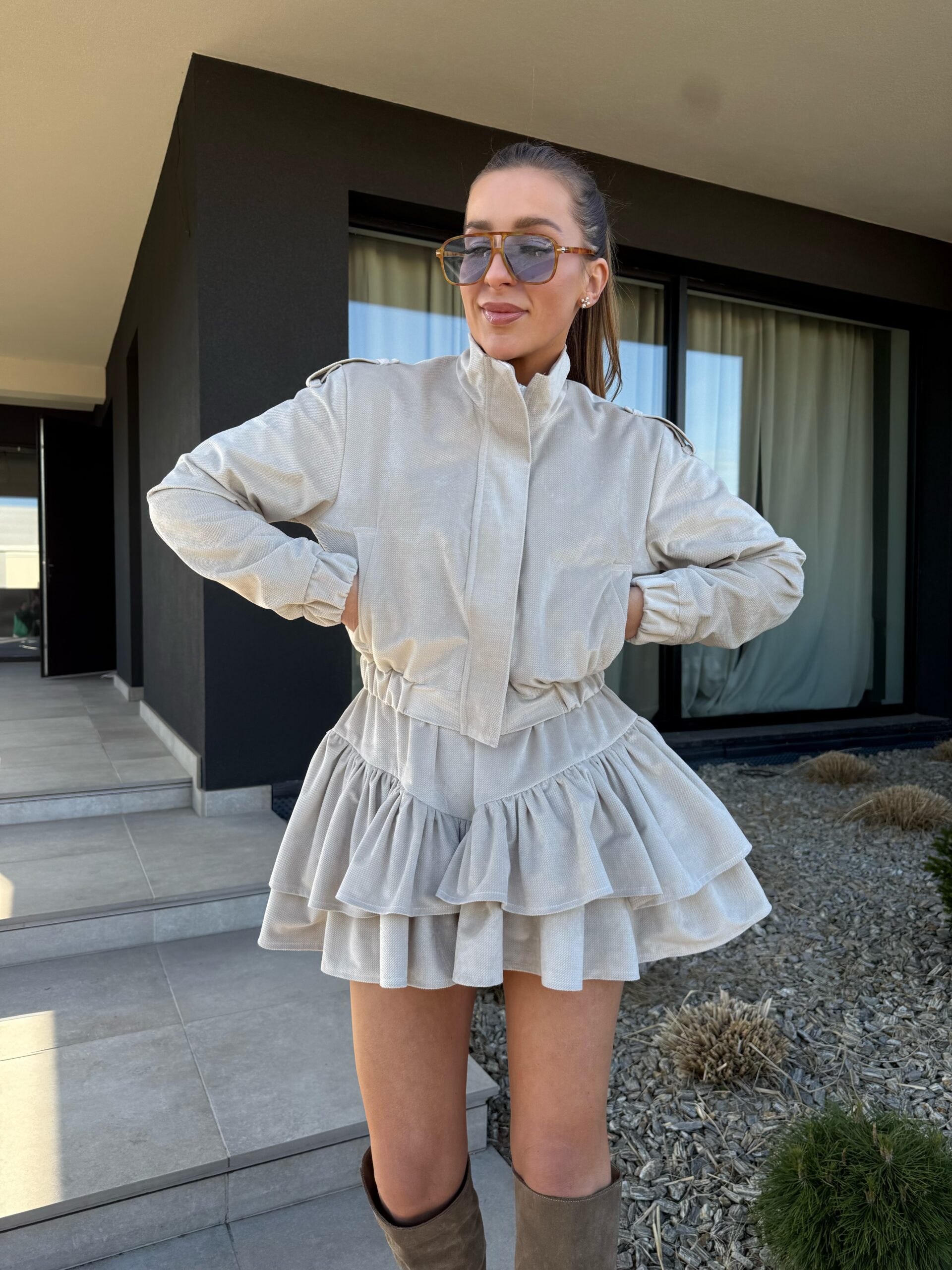 Komplet kurtka bomberka i spódniczka z falbankami . Całość uszyta z tkaniny welurowej