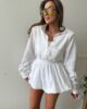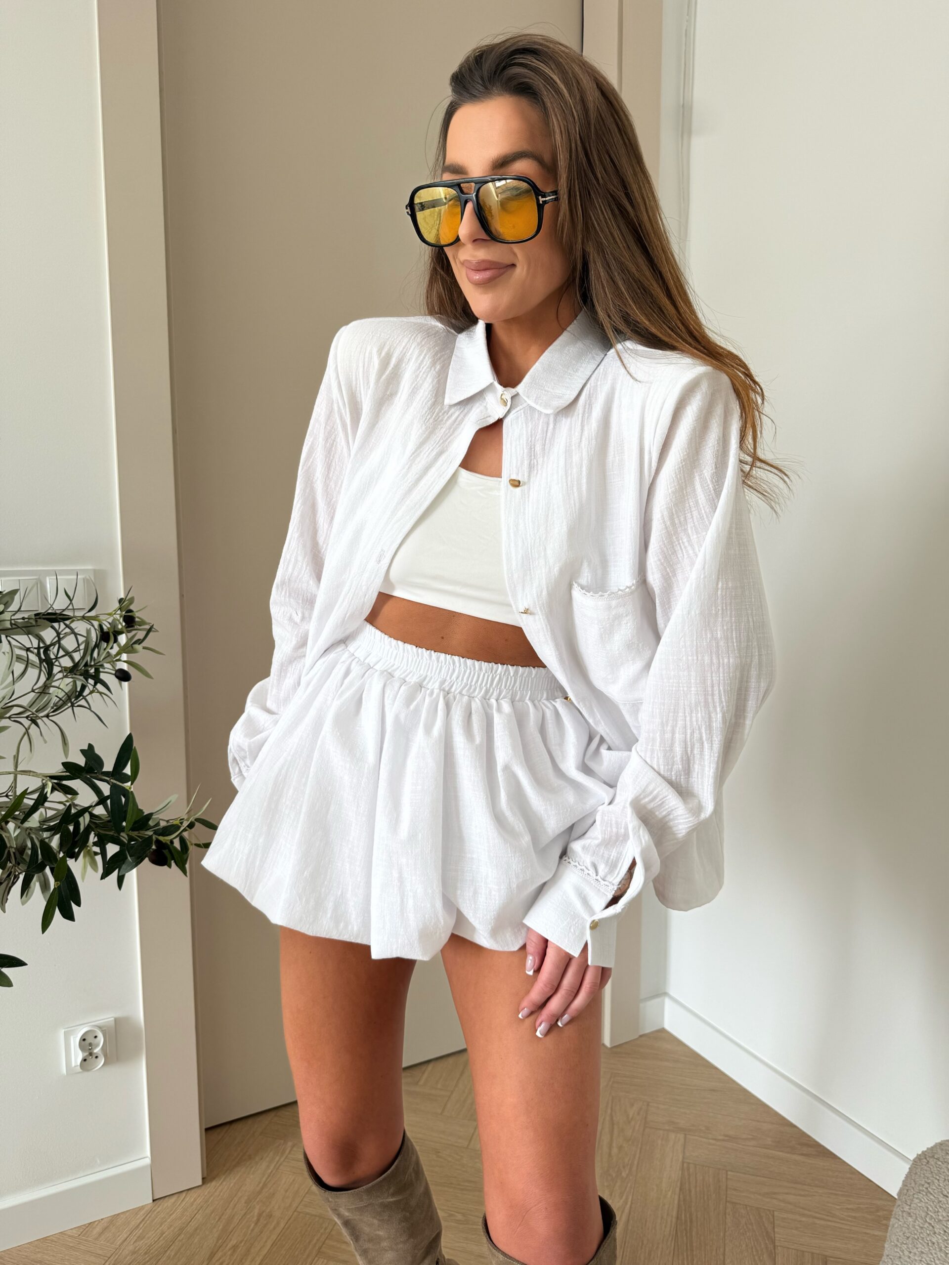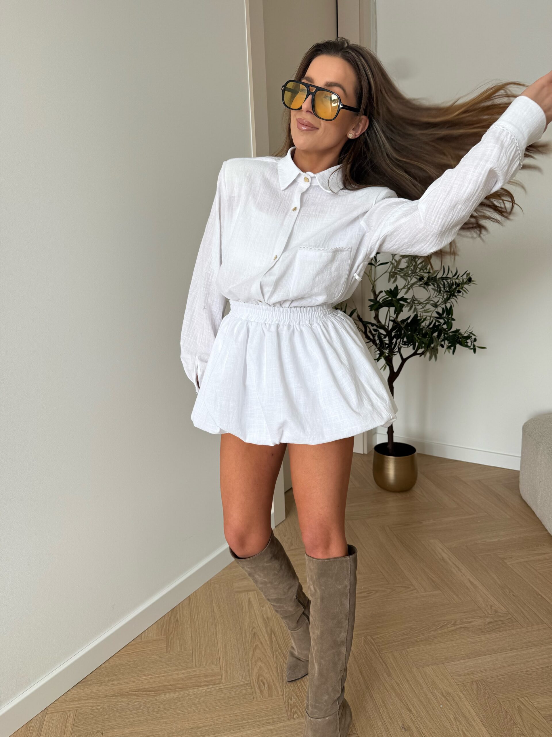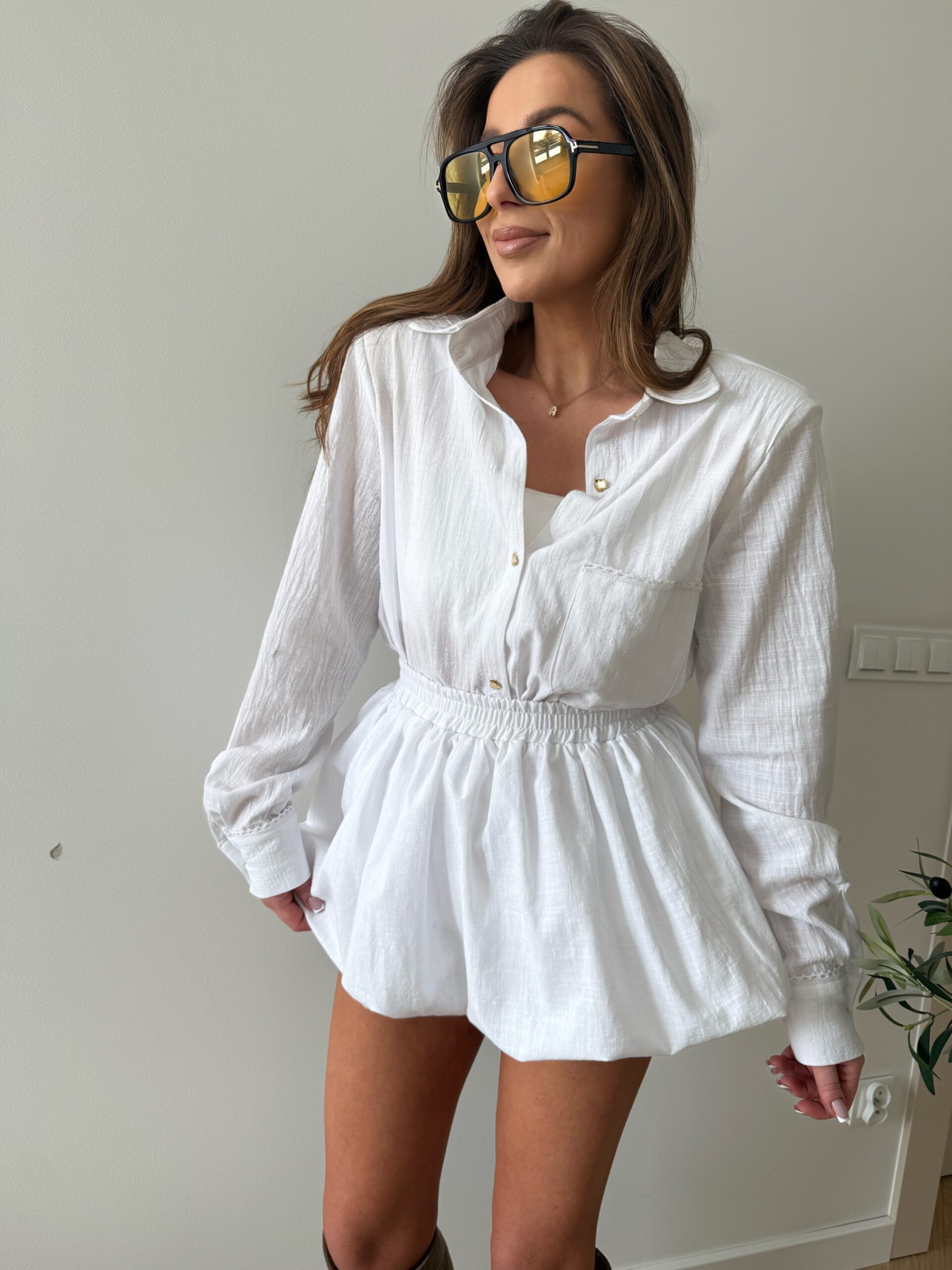 Komplet koszula z poduszkami na ramionach i spódniczka bombka. Koszula zapinana na złote guziki