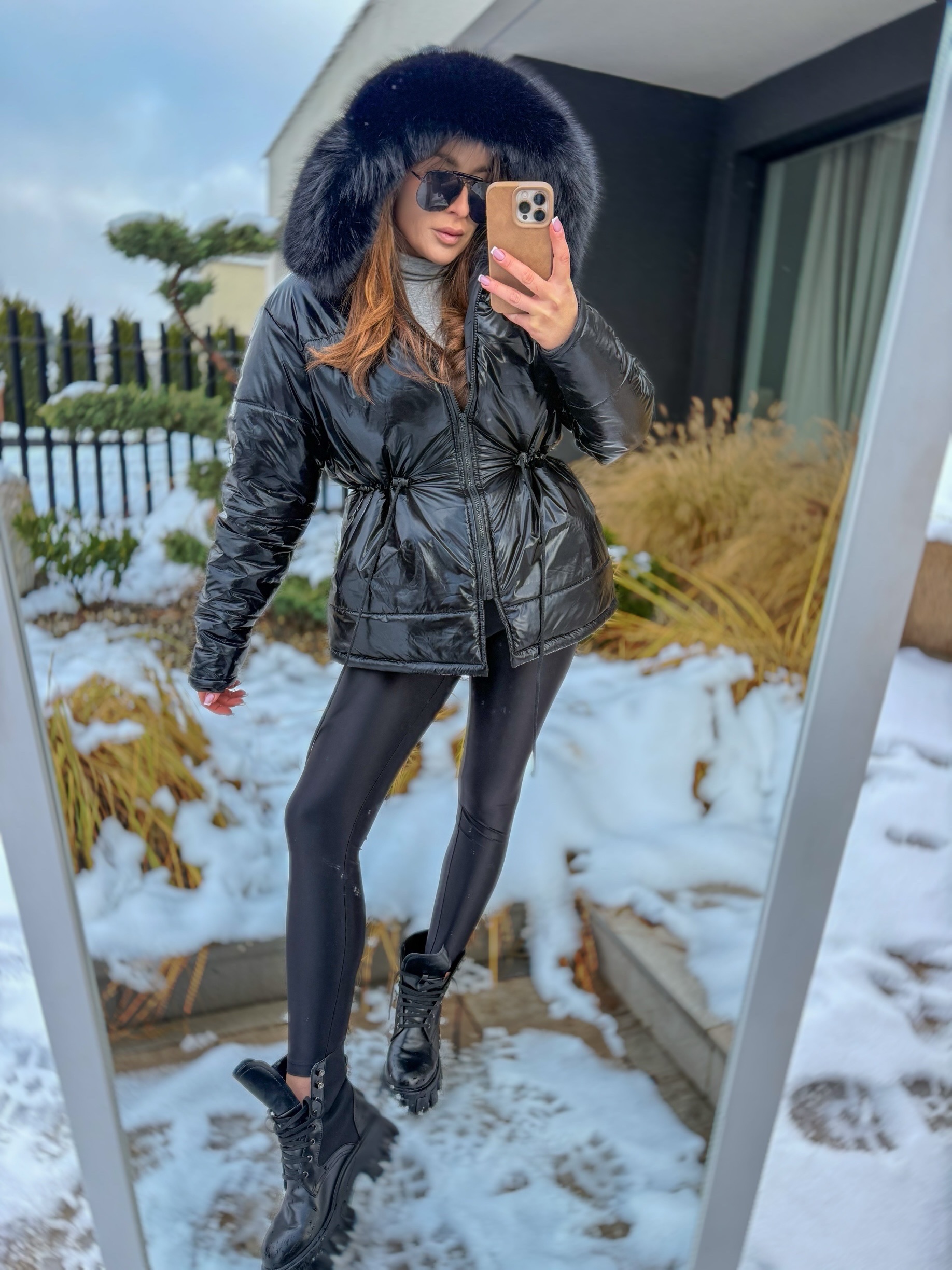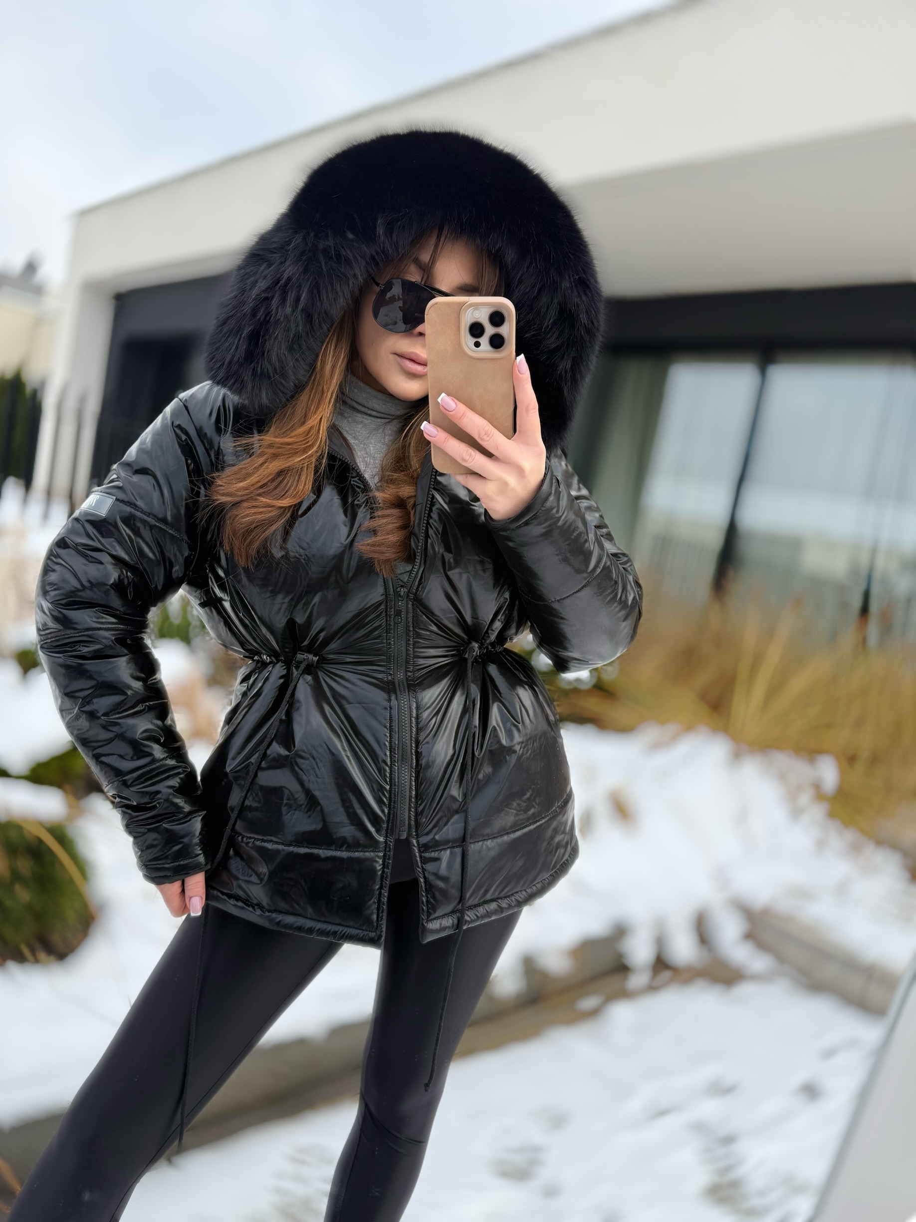 Ocieplana kurtka uszyta z przeciwdeszczowej tkaniny. Ściągacz w pasie , futerko odpinane.