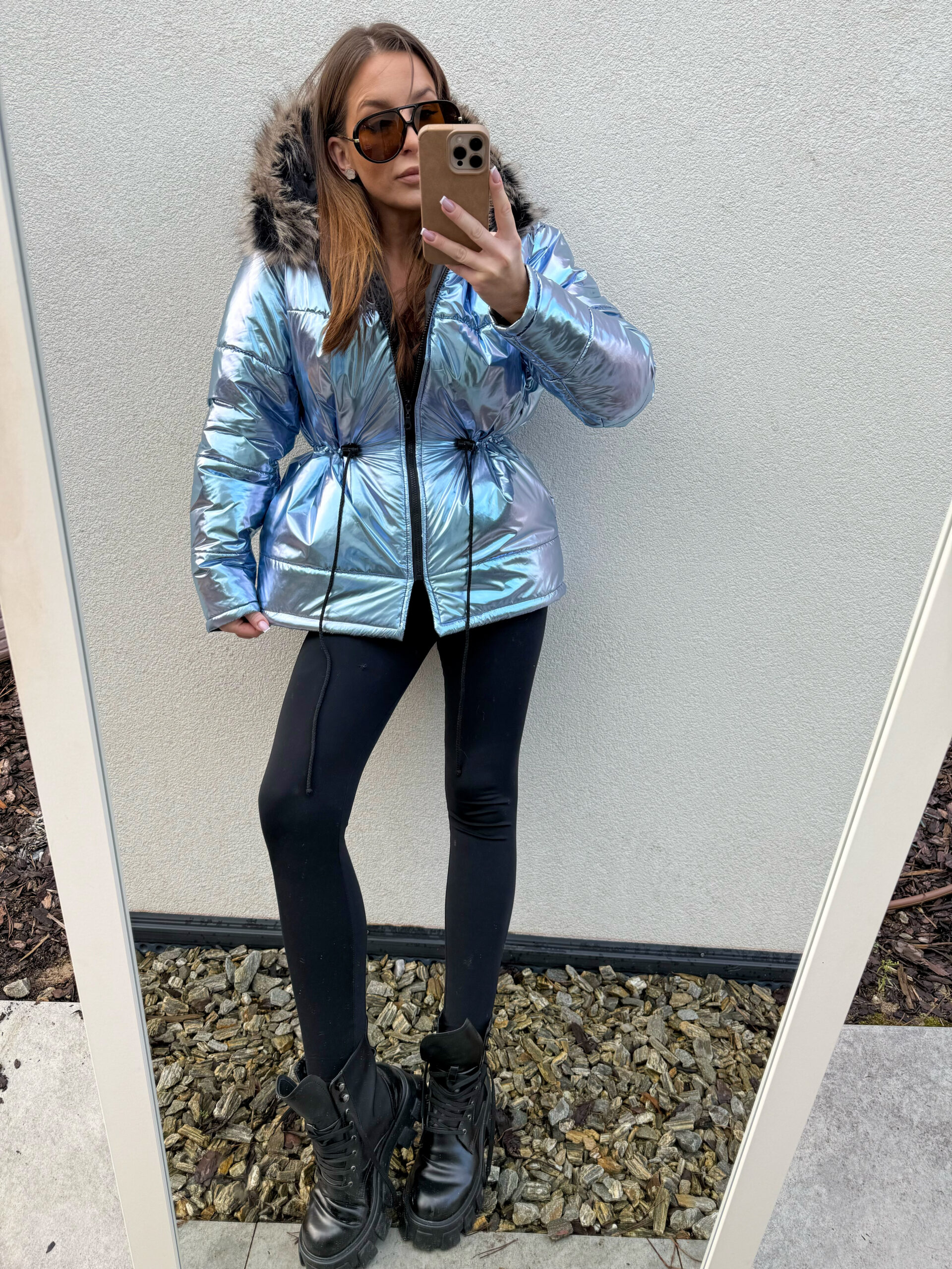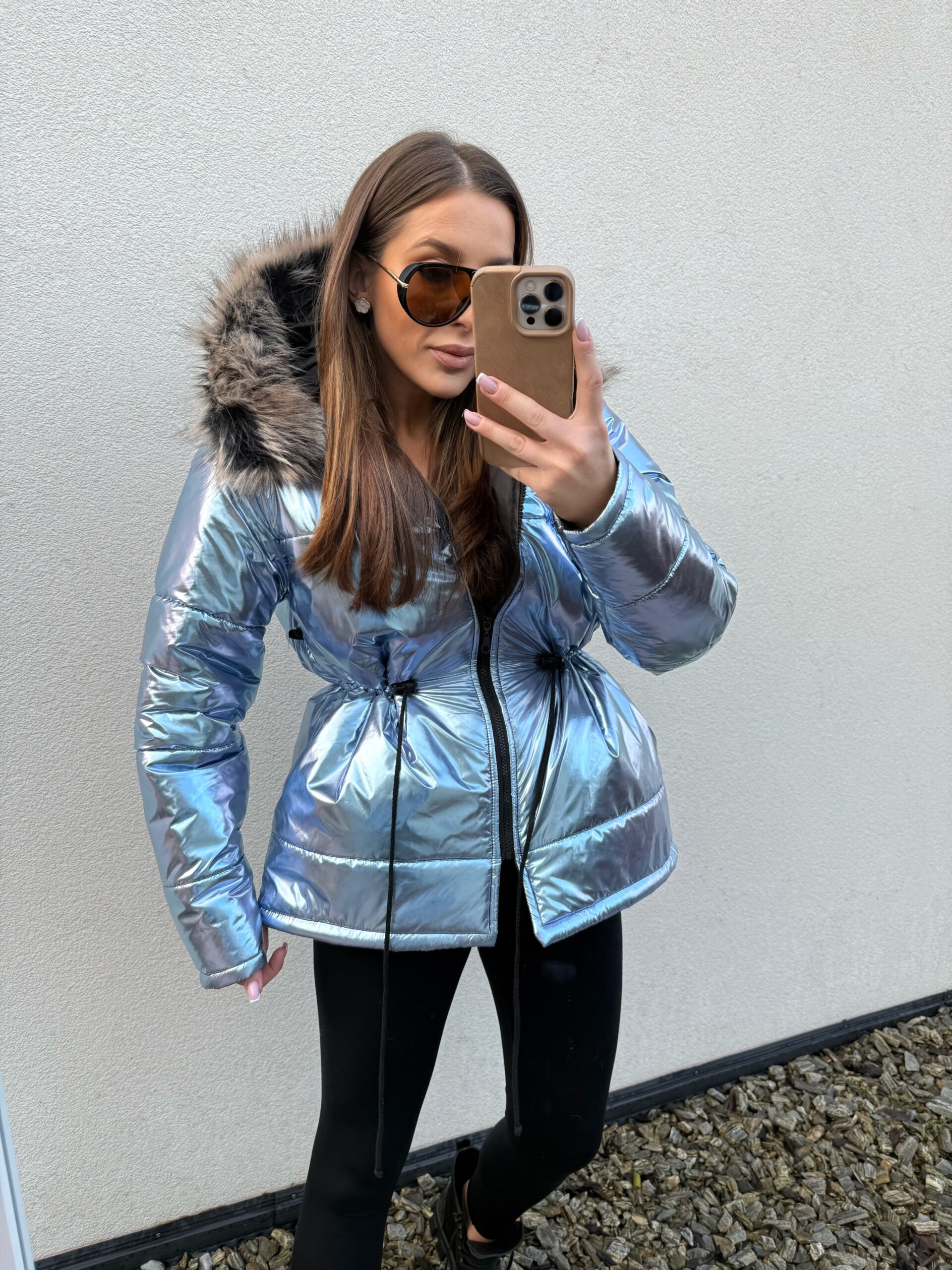 Ocieplana kurtka uszyta z przeciwdeszczowej tkaniny. W pasie ściągacz z możliwością regulacji , futerko odpinane.
