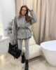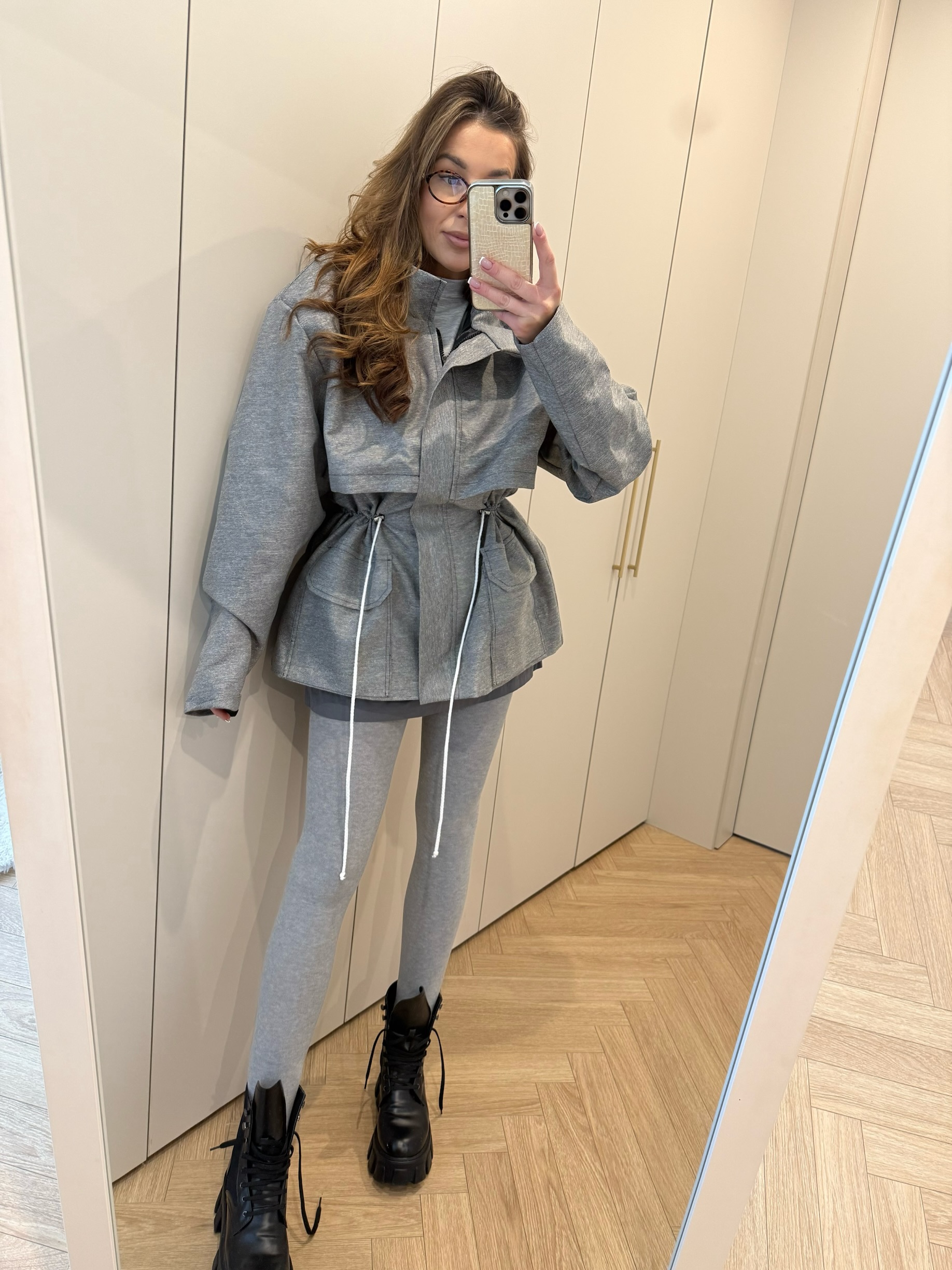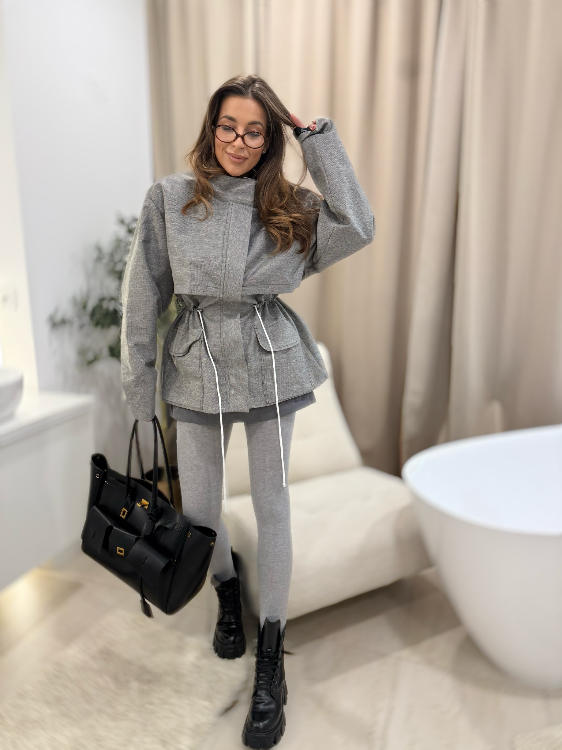 Taliowana kurtka w kolorze szarym.