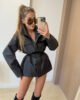 Kurtka uszyta z przeciwdeszczowej tkaniny. Taliowana ze ściągaczem w pasie.