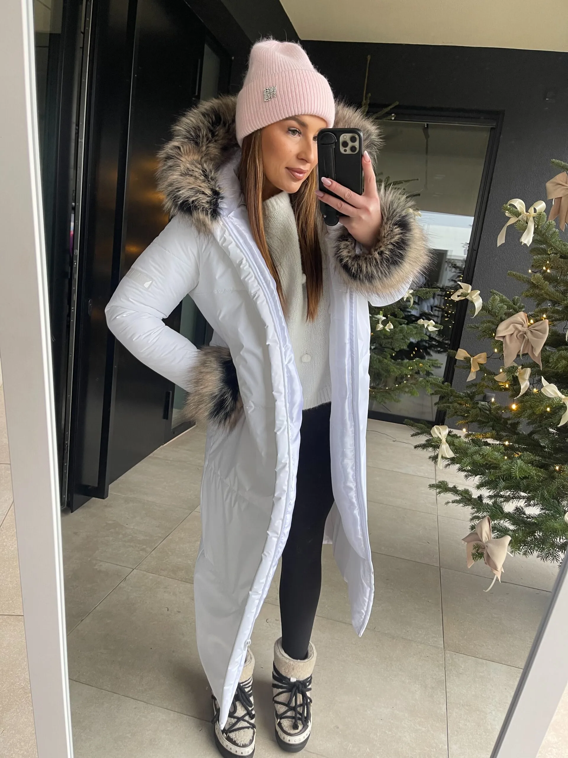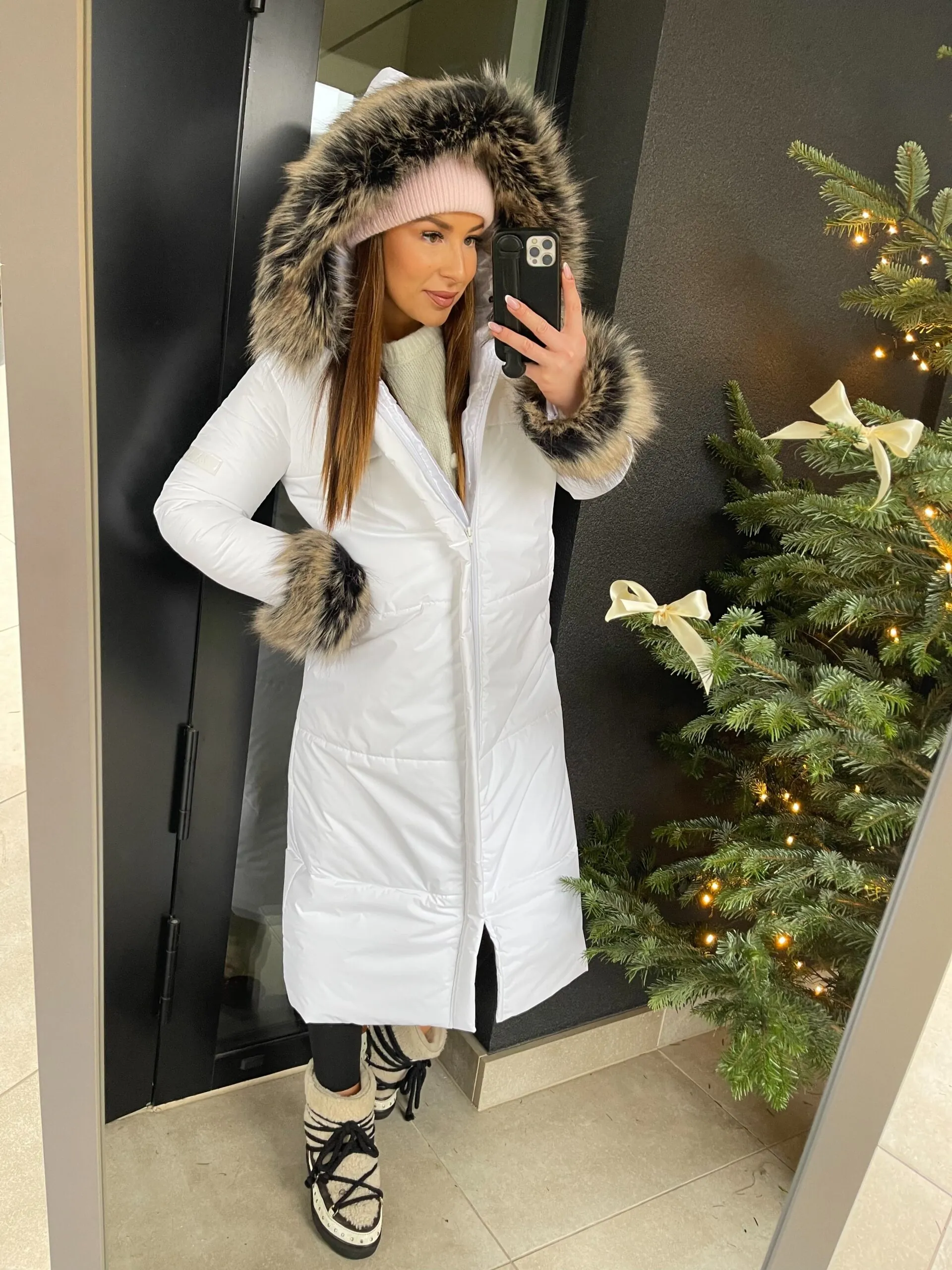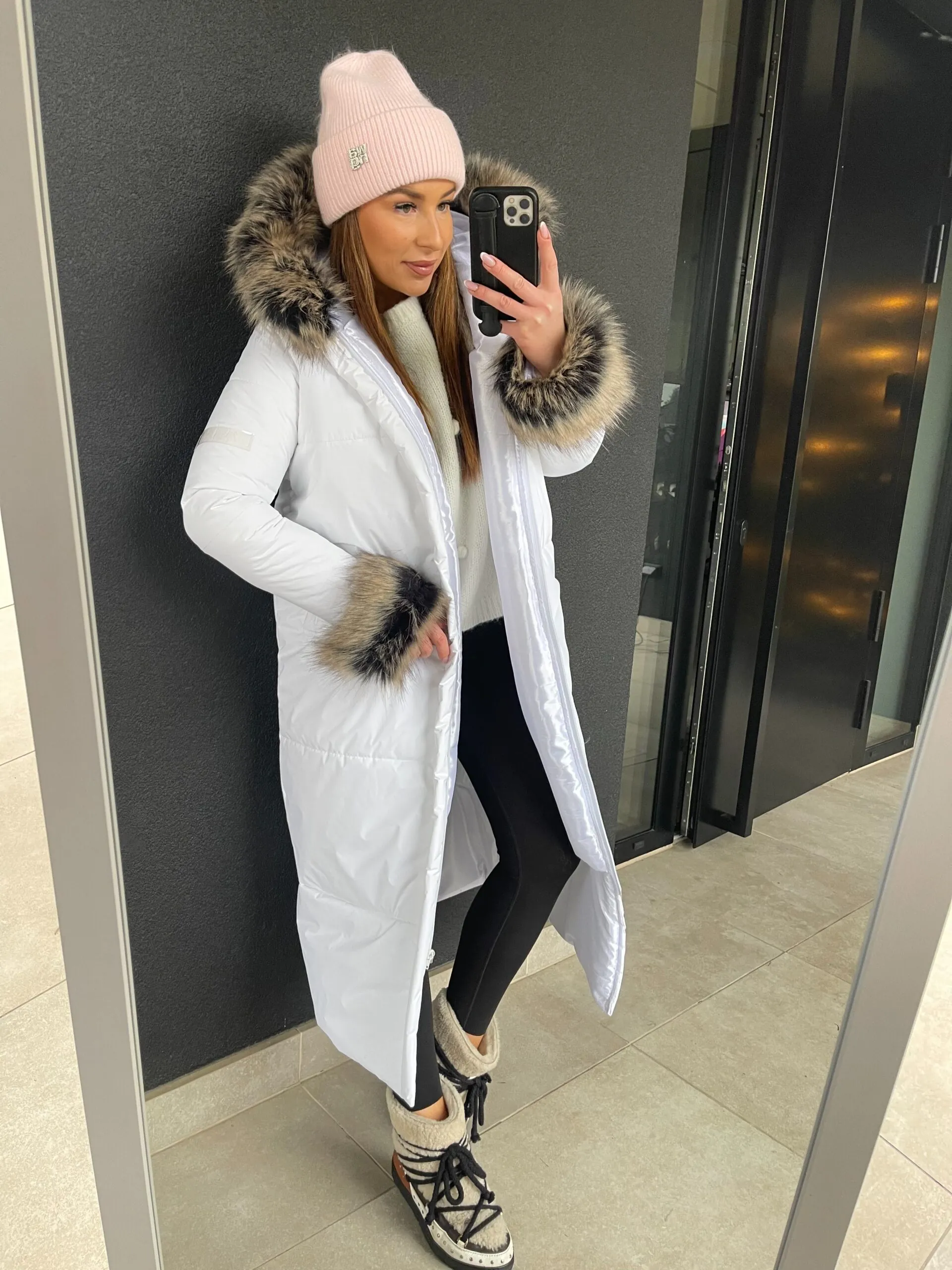 Zimowy płaszcz maxi kapturem. Futerko odpinane