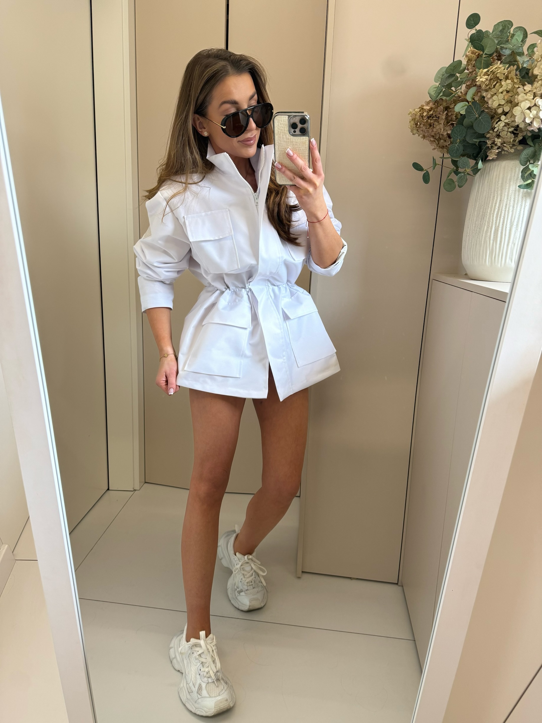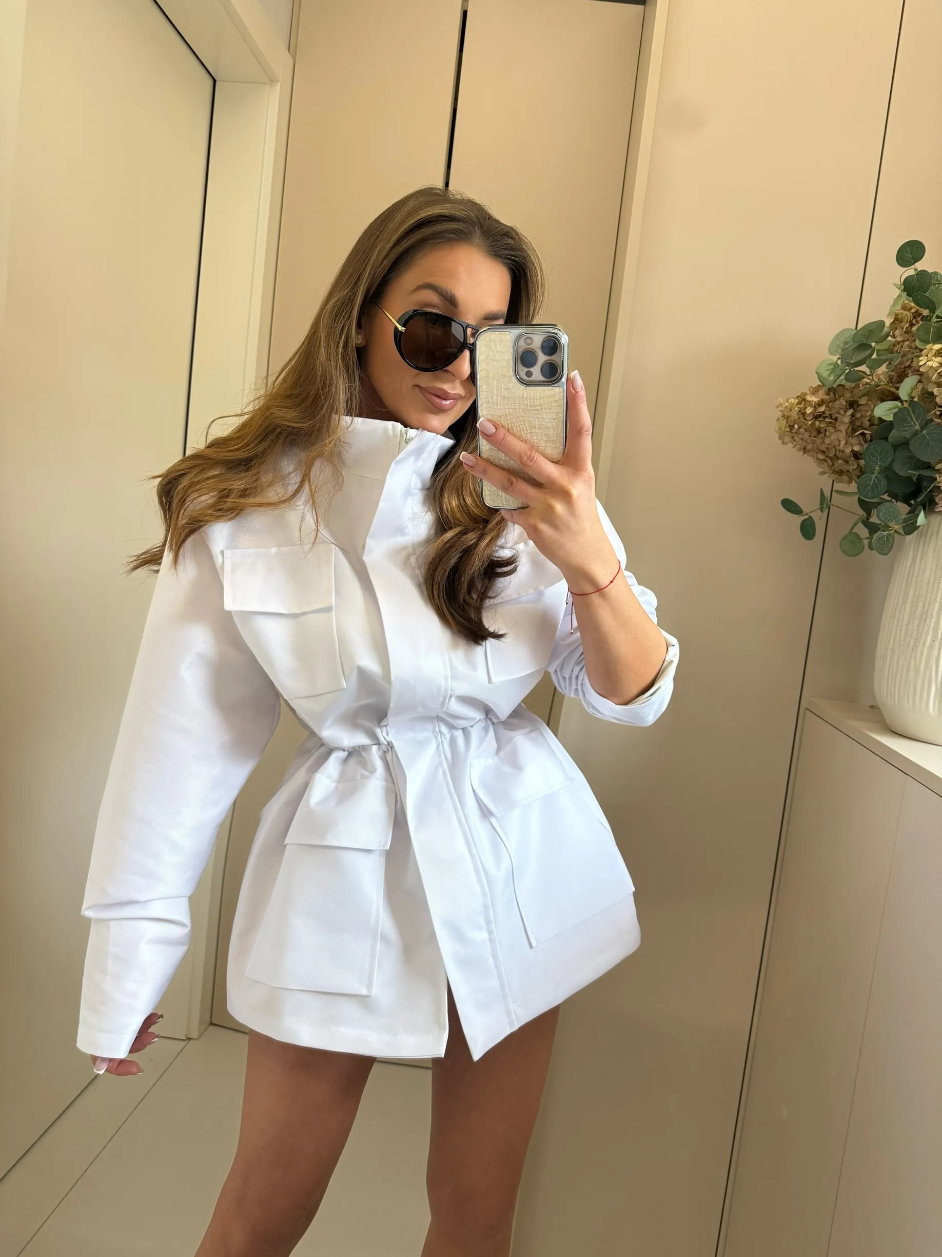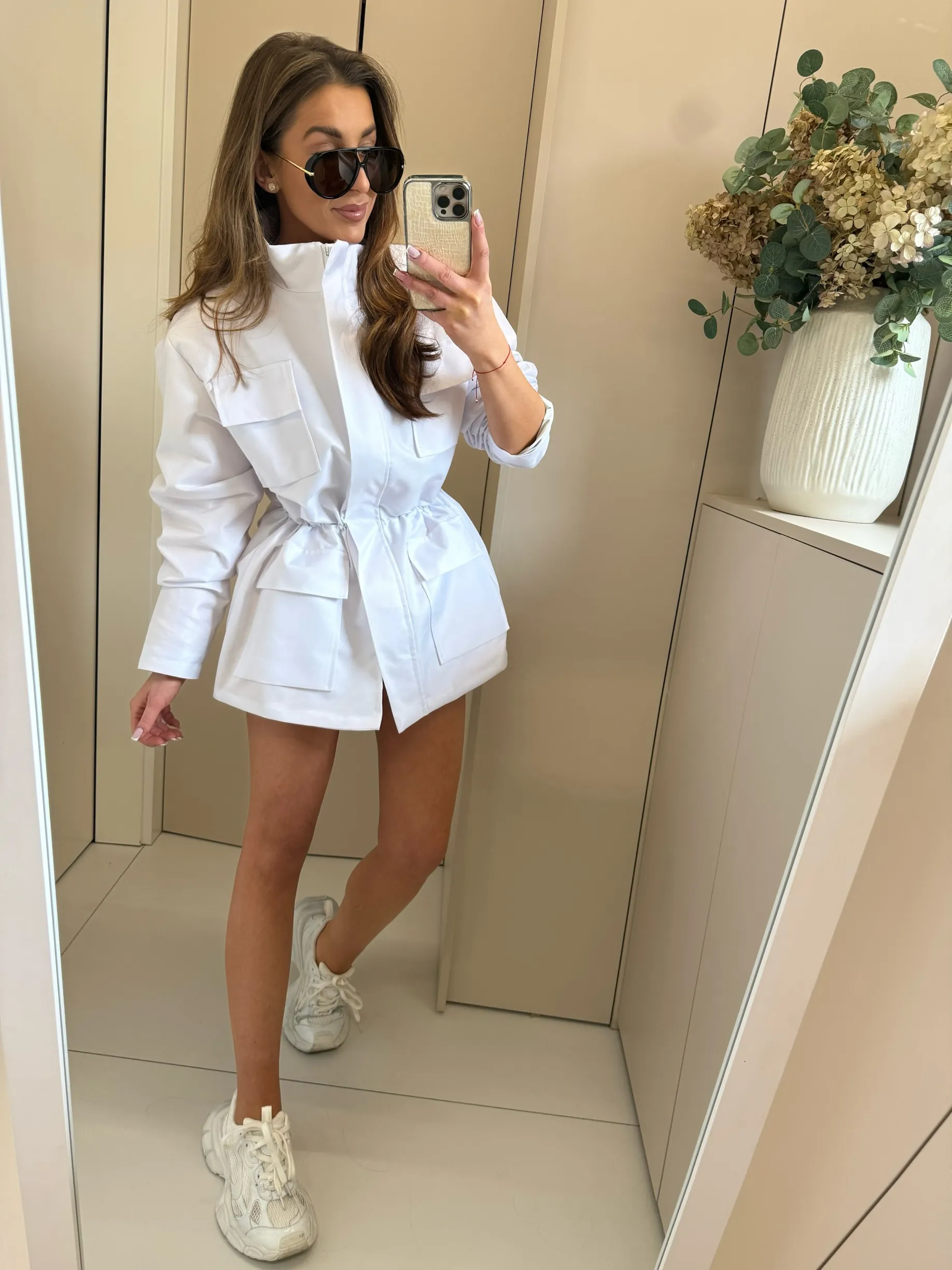 Kurtka uszyta z przeciwdeszczowej tkaniny. W pasie ściągacz z możliwością regulacji.